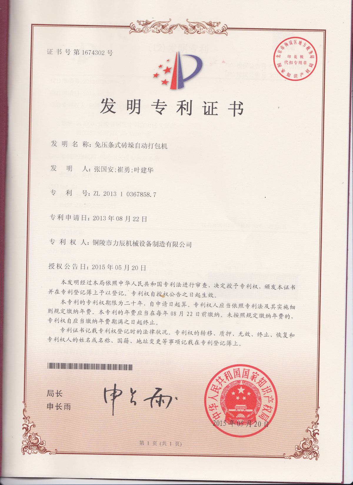 2015-06-13銅陵力辰機械近日榮獲國家專利局頒發新專利證書,該項發明專利技術極大的為客戶節約了包裝成本,并有利于公司充分發揮自主知識產權的優勢,增強公司的核心競爭力...